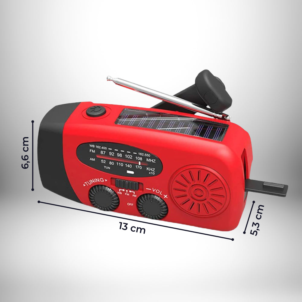 Ist der Akku leer? Kein Problem: Lade Dynox einfach über das eingebaute Solarpanel oder mit der Handkurbel – überall, jederzeit. Schon 1 Minute kurbeln reicht für bis zu 30 Minuten Licht oder Radio.